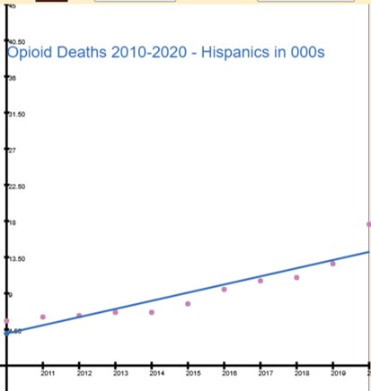 This exercise enables the student to study different trends of data related to the opioid epidemic announced by the CDC in 2017. The data has a row for each year. The information on a row is the year, followed by the number of deaths (thousands) in each of 4 population groups - White, Black, Hispanic and Native Americans. The student can pick the population group, modify two instructions (one to plot the point, the other to feed the regressions model) , and then run the model to the pattern. Students can add to the model by including instructions for printing the population group chosen and the slope and y-intercept of the line.